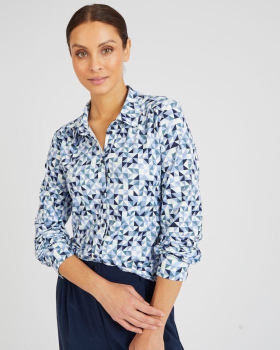 Ce chemisier en maille chaude est notre petit chouchou de la saison, pour le confort qu'il nous apporte et pour la modernité de son bel imprimé graphique.