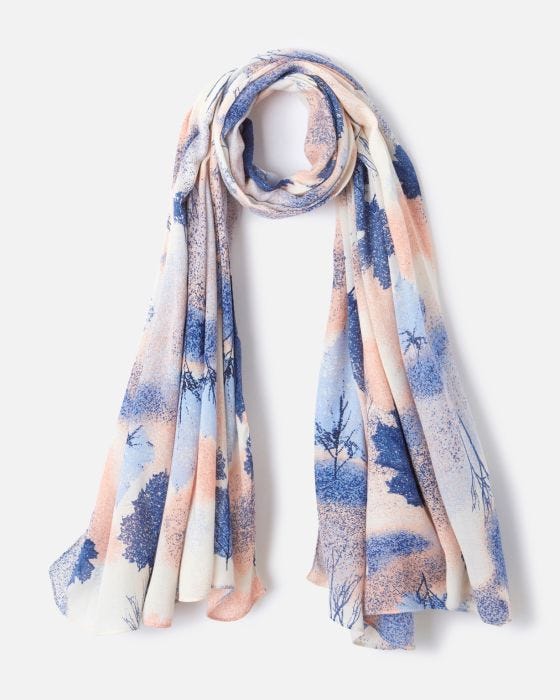 Foulard style étole en tissu émerisé au toucher doux. Motif forêt élégant aux couleurs chaudes. Forme rectangulaire à passer autour du cou. Finitions ourlet. Dimensions de l'écharpe 180 x 105 cm env.