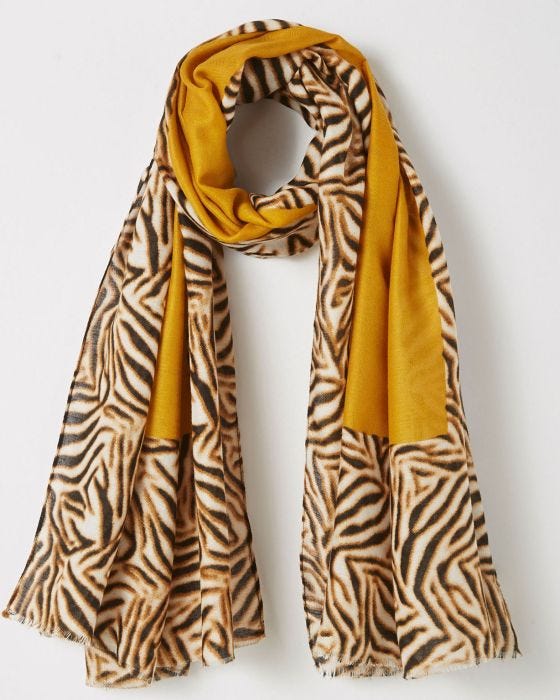 Un tissu duveteux et un motif animalier rehaussé d'un jaune curry chaleureux : parfaite association pour ce foulard qui illuminera vos tenues chic