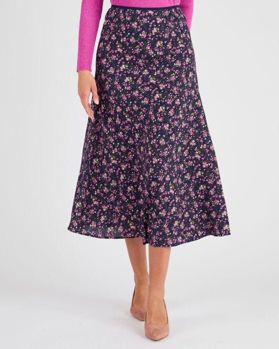 Cette jupe facile à enfiler s'habille d'un motif fleuri pour l'hiver... Elle a choisi un beau tissu léger et fluide et une coupe évasée pour égayer votre quotidien !