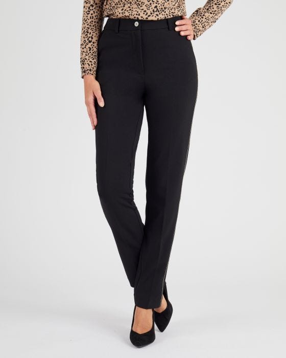 Confortable et élégant, ce pantalon en maille crêpe stretch affiche un joli tombé et des liserés brillants sur le côté de la jambe et offre un look terriblement féminin !