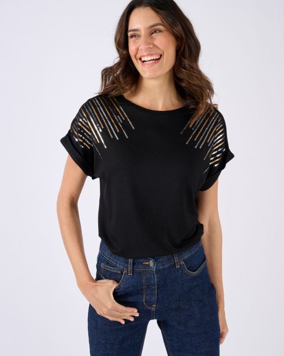 Soyez sobre, soyez brillante avec le t-shirt des fêtes qui ne laisse pas indifférent ! # Maille jersey fluide # Jeu de sequins # Manches courtes T
