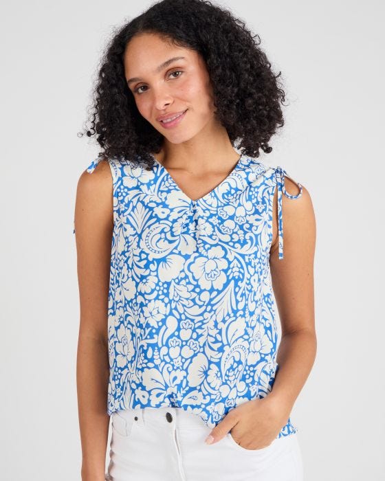 La technologie Climatyl tient sa promesse sur ce haut femme imprimé qui bénéficie d'une neutralisation des odeurs. En pure viscose Lenzing(TM) EcoVero(TM), moins gourmande en eau qu'une viscose classique, il est agréable à porter. On craque aussi pour son imprimé feuillage qui vient ajouter une touche de fraîcheur aux looks estivaux. La coupe trapèze de ce modèle femme est structurée par un pli d'aisance milieu devant et par des liens de serrage réglables aux épaules qui dessinent de jolies nouettes. A associer au pantalon coordonné vendu sur ce site pour jouer un total look plein de fraîcheur effet fausse combi. Un bas uni blanc, jupe droite, pantalon en lin ou jean viennent adoucir ce top femme. Biais de propreté au col V et aux emmanchures confortables. Base légèrement arrondie. Longueur du débardeur imprimé femme 64 cm environ.
